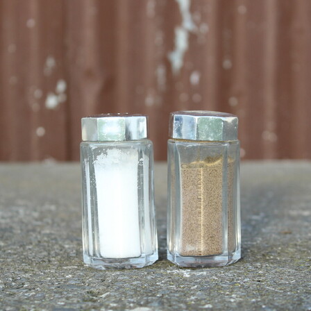 Glass salt and pepper pots with silver tops. $2.00 per set